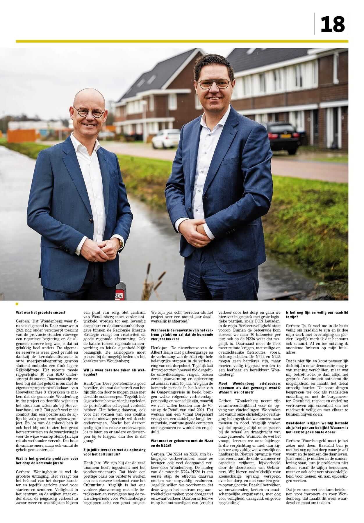 Veiligheid in het centrum en de wijken staat onder druk, de jeugdzorg verkeert in zwaar weer en wachtlijsten blijven een punt van zorg. Het centrum van Woudenberg moet verder ontwikkeld worden tot een levendig dorpshart en de duurzaamheidsopgave binnen de Regionale Energie Strategie vraagt om creativiteit en goede regionale afstemming. Ook de balans tussen regionale samenwerking en lokale eigenheid blijft belangrijk. De asielopgave moet passen bij de mogelijkheden en het karakter van Woudenberg.’